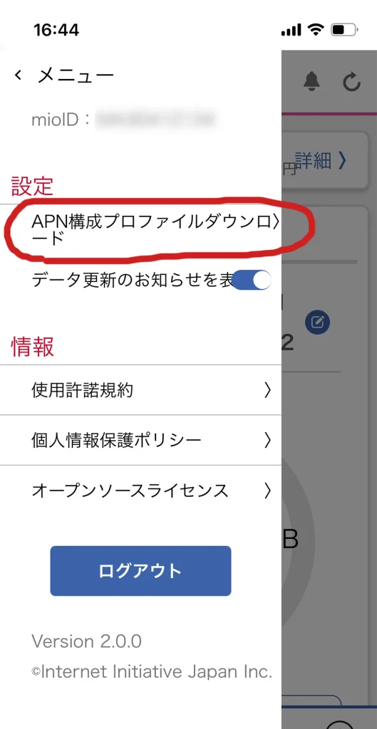 IIJMIOの場合は、IIJMIOのアプリのメニューから簡単にダウンロードができます。
