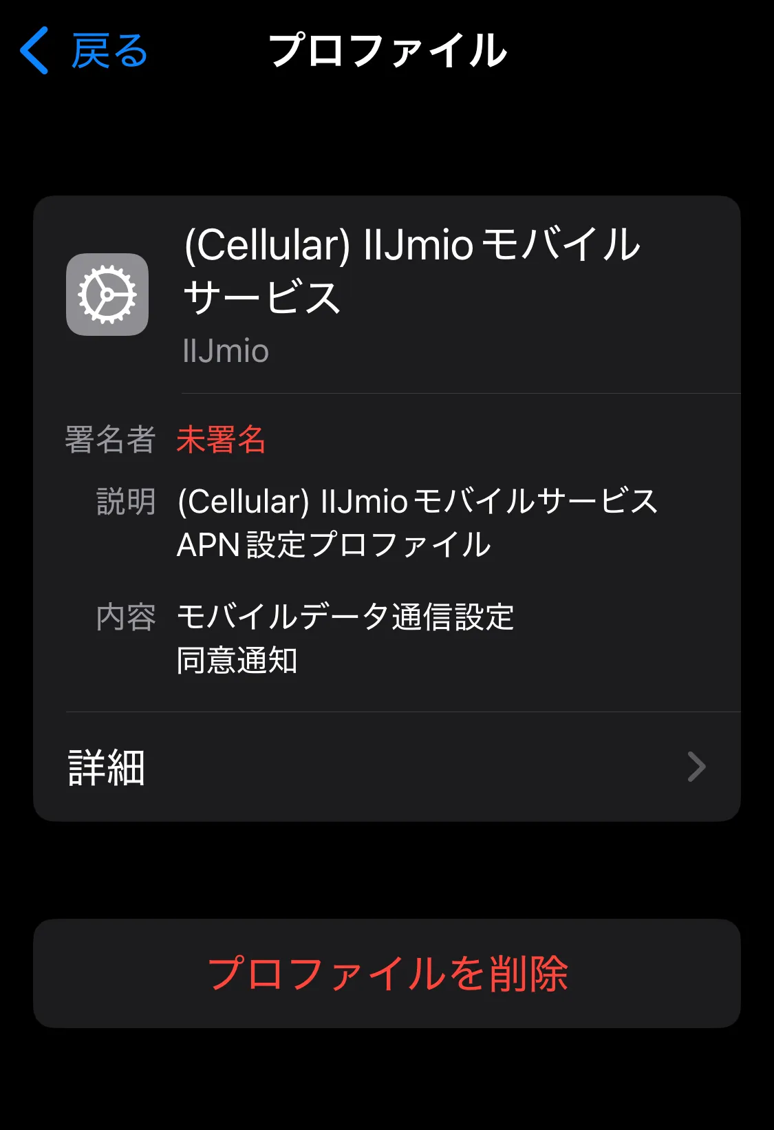 から日本で使ってるIIJMIOの構成プロファイルを選択して、削除!