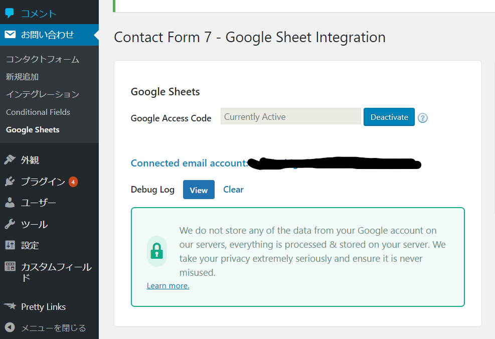 プラグインのCF7 Google Sheet Connectorを使うと簡単。