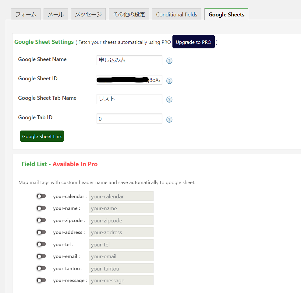 3.CF7の設定画面でGoogle Spread SheetのIDとタブ番号を設定。