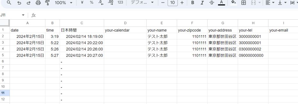 date, time列は書いておけば自動で入る。但し時間が9時間進んでいることがある。その場合、C列に関数を入れて日本時間を設けてやればいい。