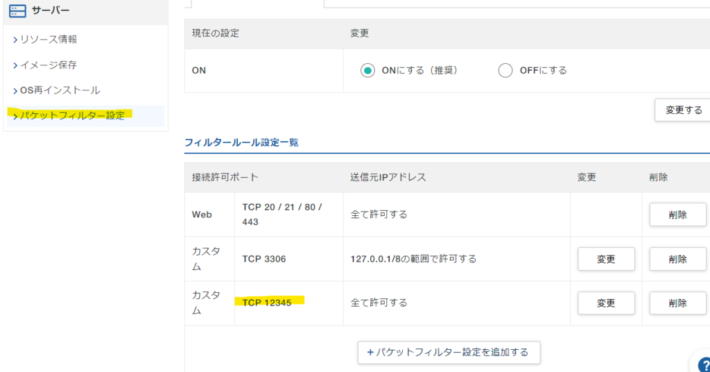 4.管理パネルからパケットフィルターを開いてポート12345を追加。ポート22は削除。